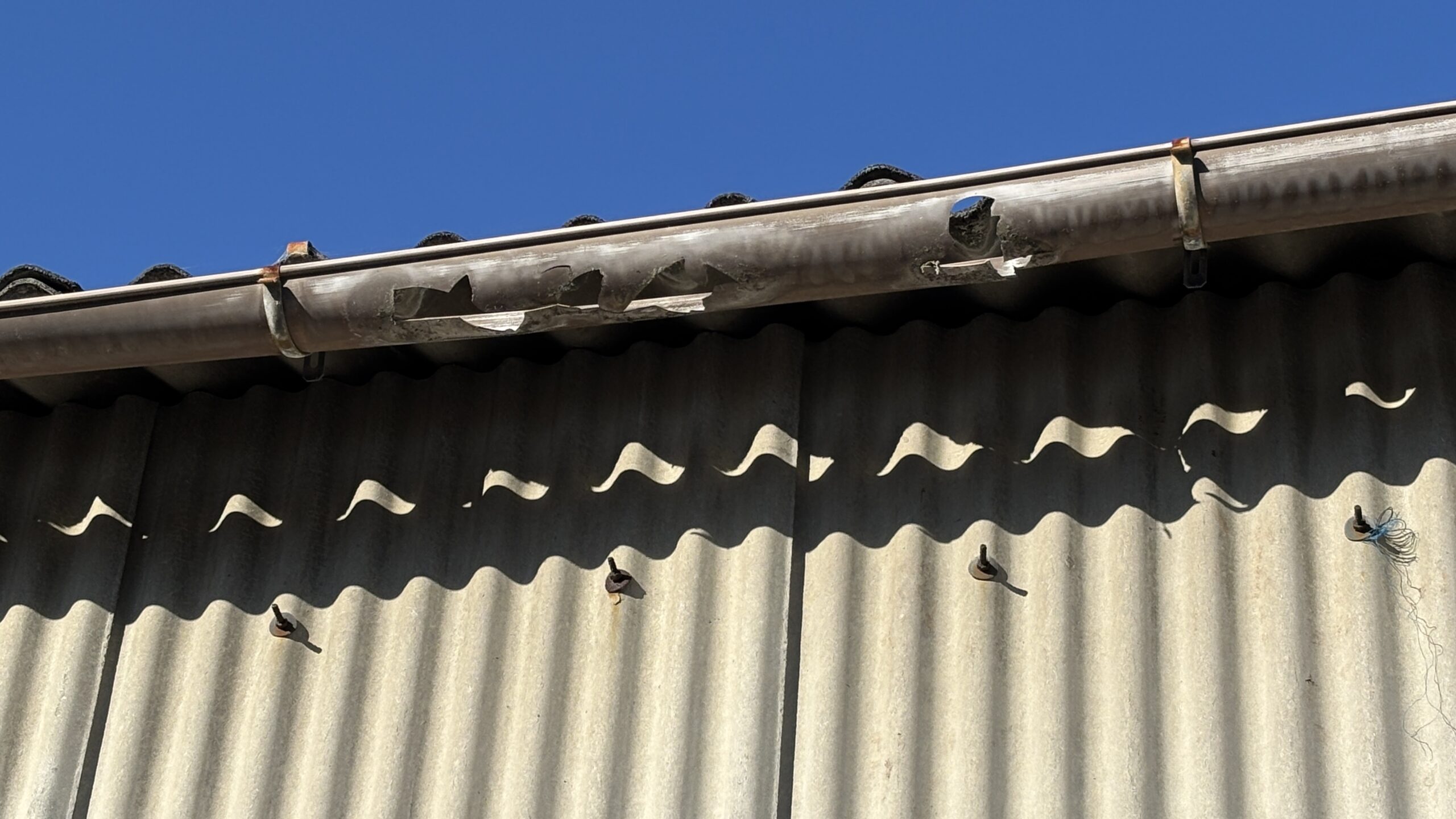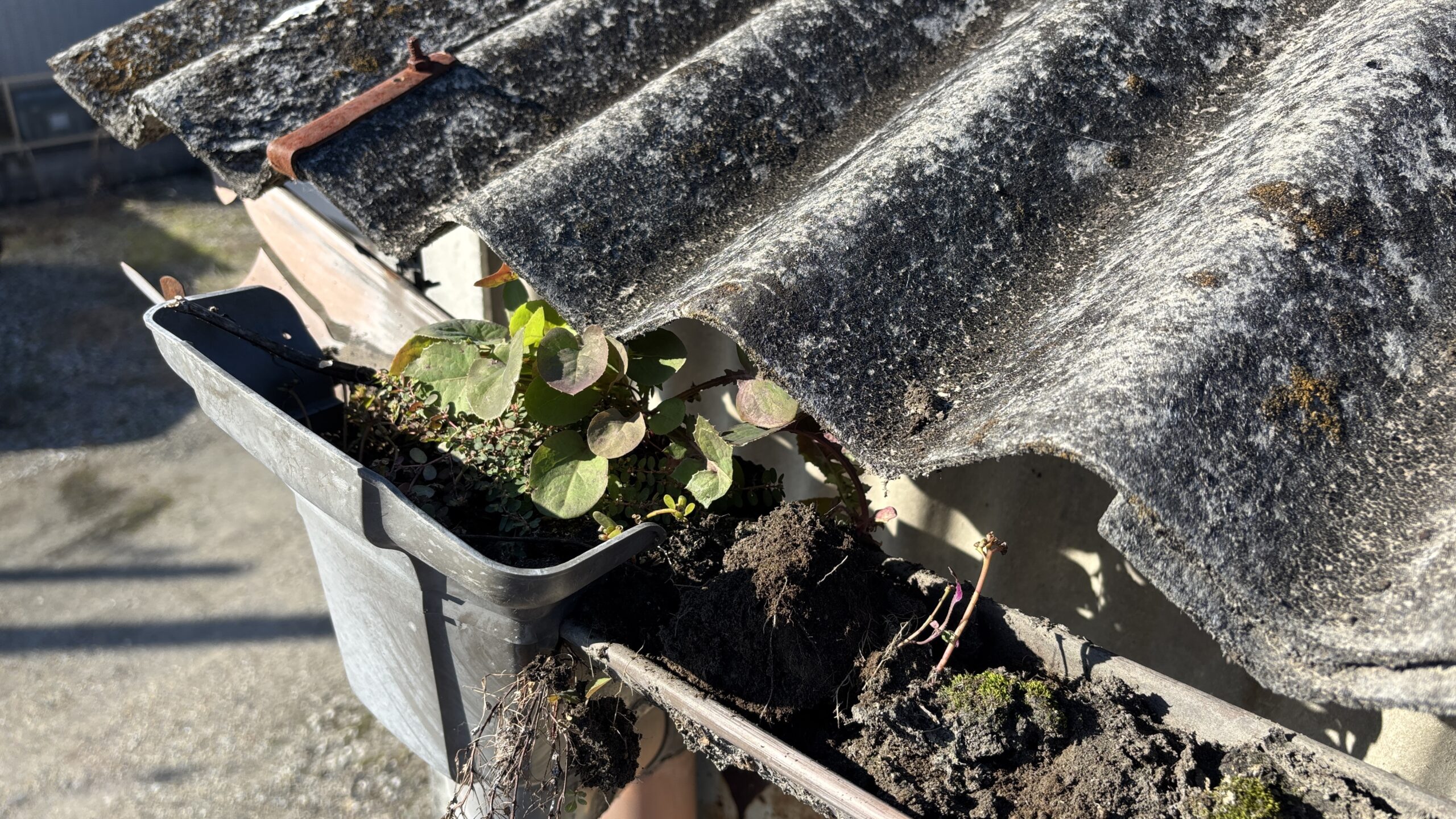 雨樋の破損を放置していたら、雨だれが地面にはねて壁と柱が腐食してしまいます。遅ればせながら軒樋の取替をご依頼いただきました。集水器にはこんもりと土がたまっており、その原因はボール遊び(?)でジャストサイズで竪樋が埋まってました・・。今回は費用を抑えるために、軒樋の交換と竪樋の清掃をいたしましたが、きれいに修繕できました。